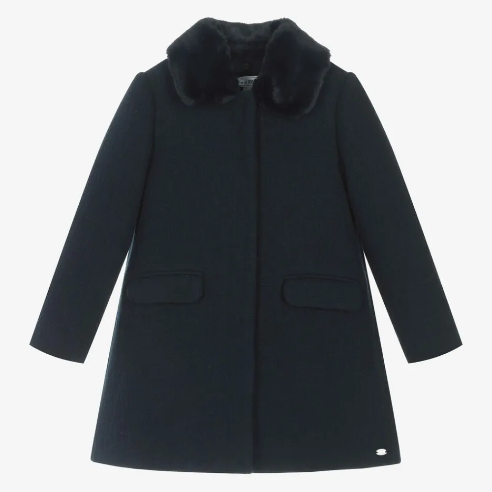 Effortlessly smart navy blue coat for girls by French brand, Tartine et Chocolat. Woven in a soft cotton and wool blend, this traditional coat has a chic, simple design and a silky lining for comfort. It fastens with concealed poppers on the front and has neat flap pockets for little hands. For a cosy touch, it has a plush faux fur collar, which can be detached with discreet buttons.