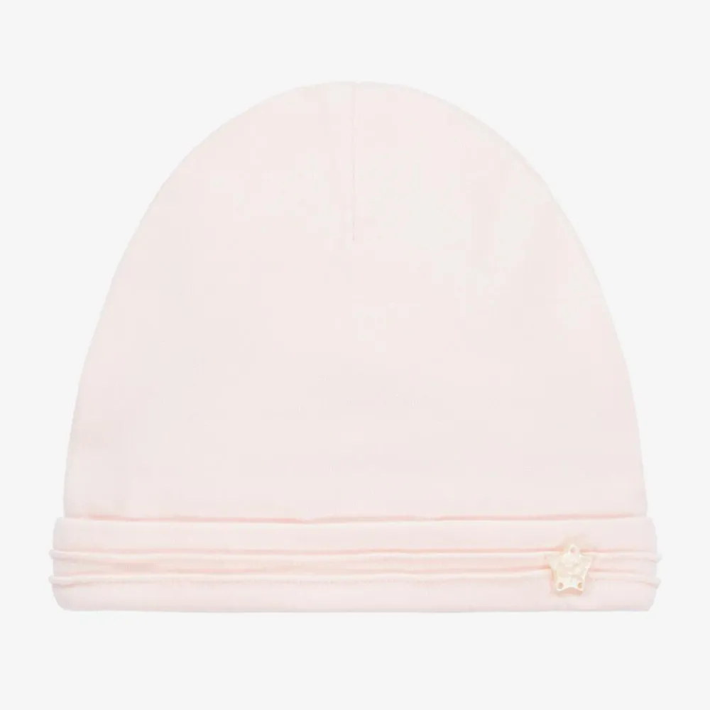 A soft layette hat for baby girls, by Tartine et Chocolat. Made from two layers of comfortable pale pink cotton jersey, it has a star logo charm sewn on the turned-up brim.