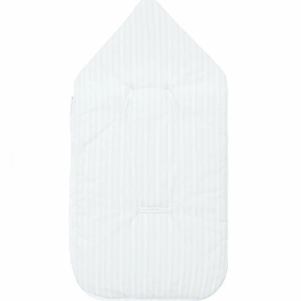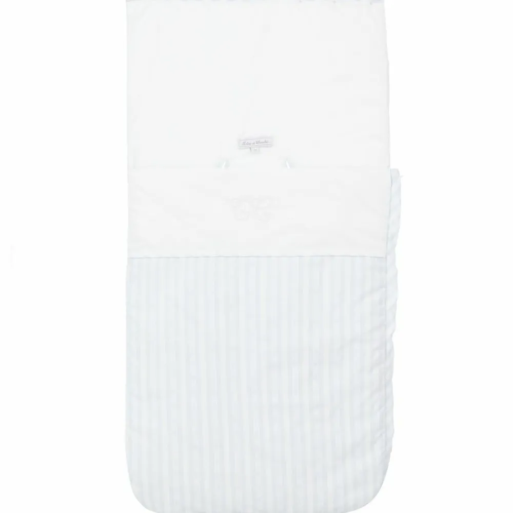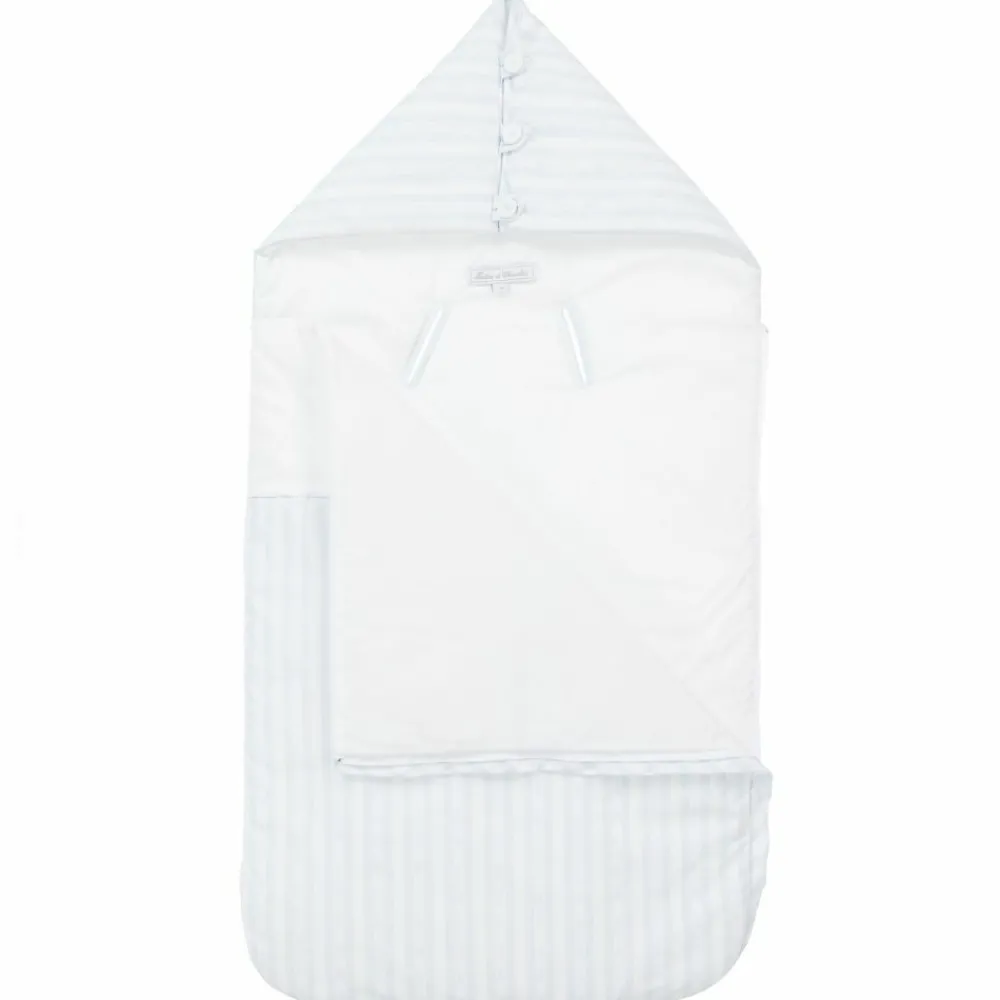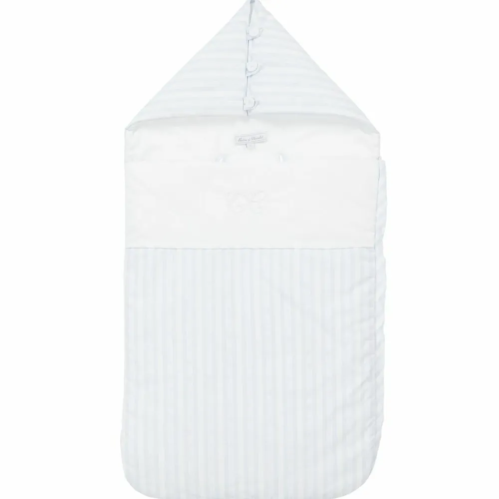 Pale blue and white striped baby nest for boys by Tartine et Chocolat. It is made in soft cotton, with a large embroidered logo on the front. The fabric-covered buttons on the hood can be opened to form a flat surface and the three slits on the back can be used to secure the nest to a car seat or buggy.