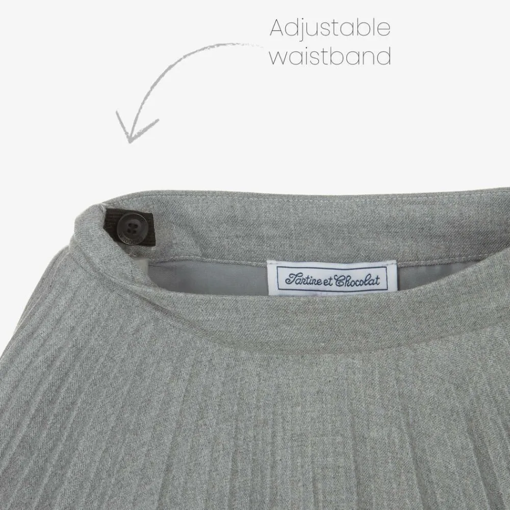 Pleated grey marl skirt for girls by classic French brand Tartine et Chocolat, made in a soft viscose blend. Fully lined with satin fabric, it has an adjustable waistband for a great fit. The skirt fastens with a button and concealed zip fastening on one side.