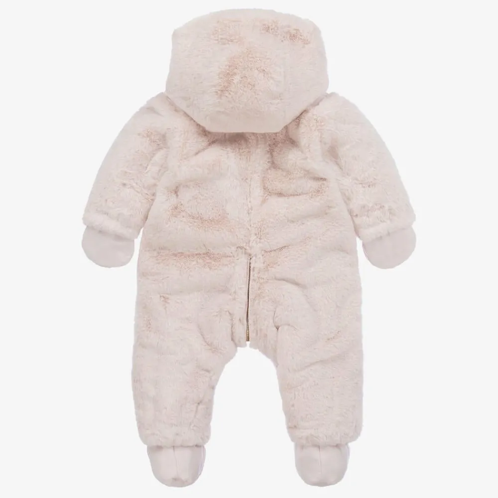 A pale pink puffer snowsuit for baby girls from Tartine et Chocolat, reversible for different looks. Super cosy with mid-weight padding, one side is silky-smooth, whilst the other is made in fluffy, plush faux fur. With scalloped trims, both sides have popper-closing pockets with logo engraving, and the golden front zip has a useful, protective chin guard. This hooded snowsuit includes handy mittens and booties, attaching with poppers, for additional warmth.