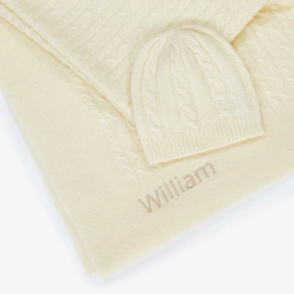 A delightful personalised hamper for baby boys and girls by The Baby Gifting Company. A thoughtful festive gift, this beautifully presented set includes a cuddly Christmas-themed teddy bear, natural wooden hairbrush and soft hooded towel, with fun 3D ears. Adding those luxurious touches, the cashmere blanket and hat have a cable knit design and the three-piece outfit is knitted in soft organic cotton. This charming gift is complete with wooden blocks to showcase baby’s precious milestones.