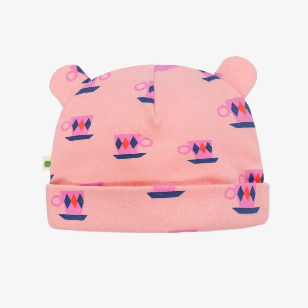 Adorable pale pink organic cotton hat for baby girls by the bonniemob, with a fun and playful tea time pattern. Made from comfortable jersey, this sweet hat has a turn-up brim and cute little 3D ears on the top.
