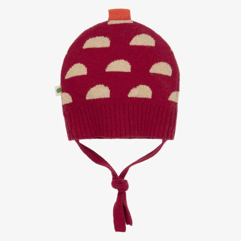 A burgundy red knitted acorn hat for baby boys and girls by the bonniemob, made in a blend of beautifully soft organic cotton and cashmere. Lovely for keeping baby cosy and warm, it has a lightly ribbed brim and knitted ties to secure under the chin.
