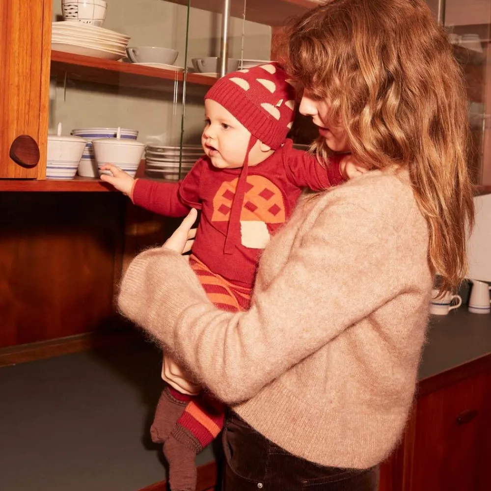 Cosy and comfortable for baby boys and girls, these red and orange striped leggings are from British Brand, the bonniemob. They are knitted in a beautifully soft organic cotton and cashmere blend with a ribbed pattern and have a gently elasticated waistband. The designer's signature apple logo tab is stitched on the hip for a subtle branded touch.