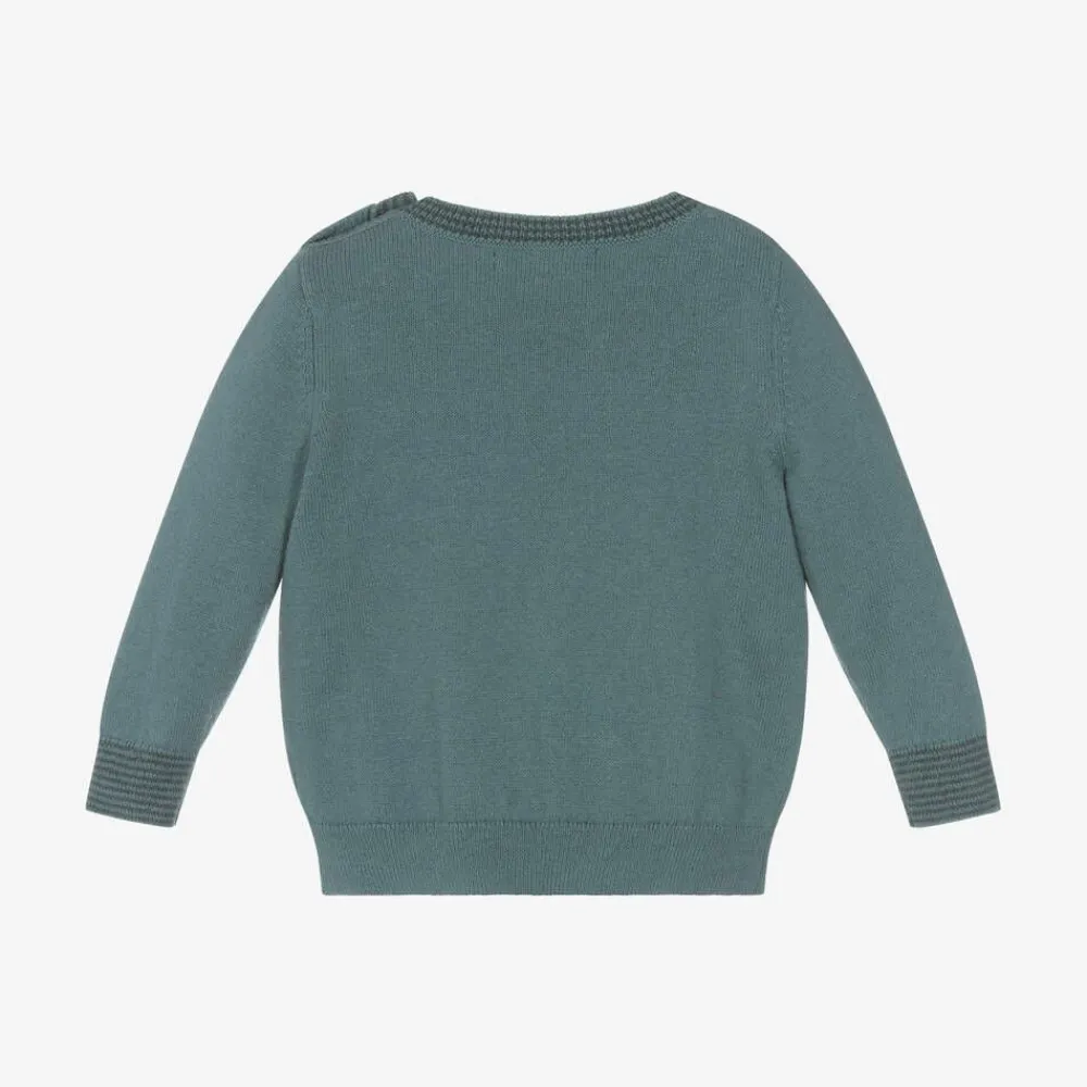 Green sweater for baby boys and girls by British brand the bonniemob, knitted in soft organic cotton with a touch of cashmere for added warmth and a touch of luxury. It has ribbed trims and a cute beige and green smiling acorn on the front. There are useful button fastenings on one shoulder and the designer's signature apple logo tab on one side seam.