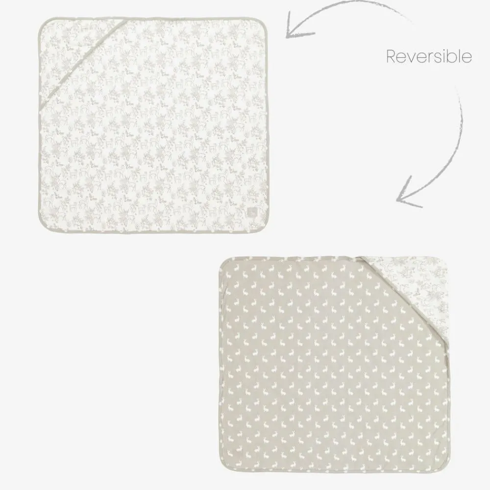 Grey babysuit set for boys and girls by The Little Tailor, made from soft cotton jersey for a gentle feel. The romper is patterned with sweet woodland animals and finished with ribbed knit trims on the neckline and cuffs. The full zip front, allowing for easy nappy changes, has a protective zip guard under the chin for added comfort. In a white hare print, the long-sleeved bodyvest has a crossover front and fastens with poppers for easy dressing. The matching hat has an adorable knotted detail on the top and a turned-up brim. Ideal for the cot or car seat, the reversible, hooded blanket features coordinating patterns on either side. Making a lovely gift set, it also comes with a gift bag and tag.