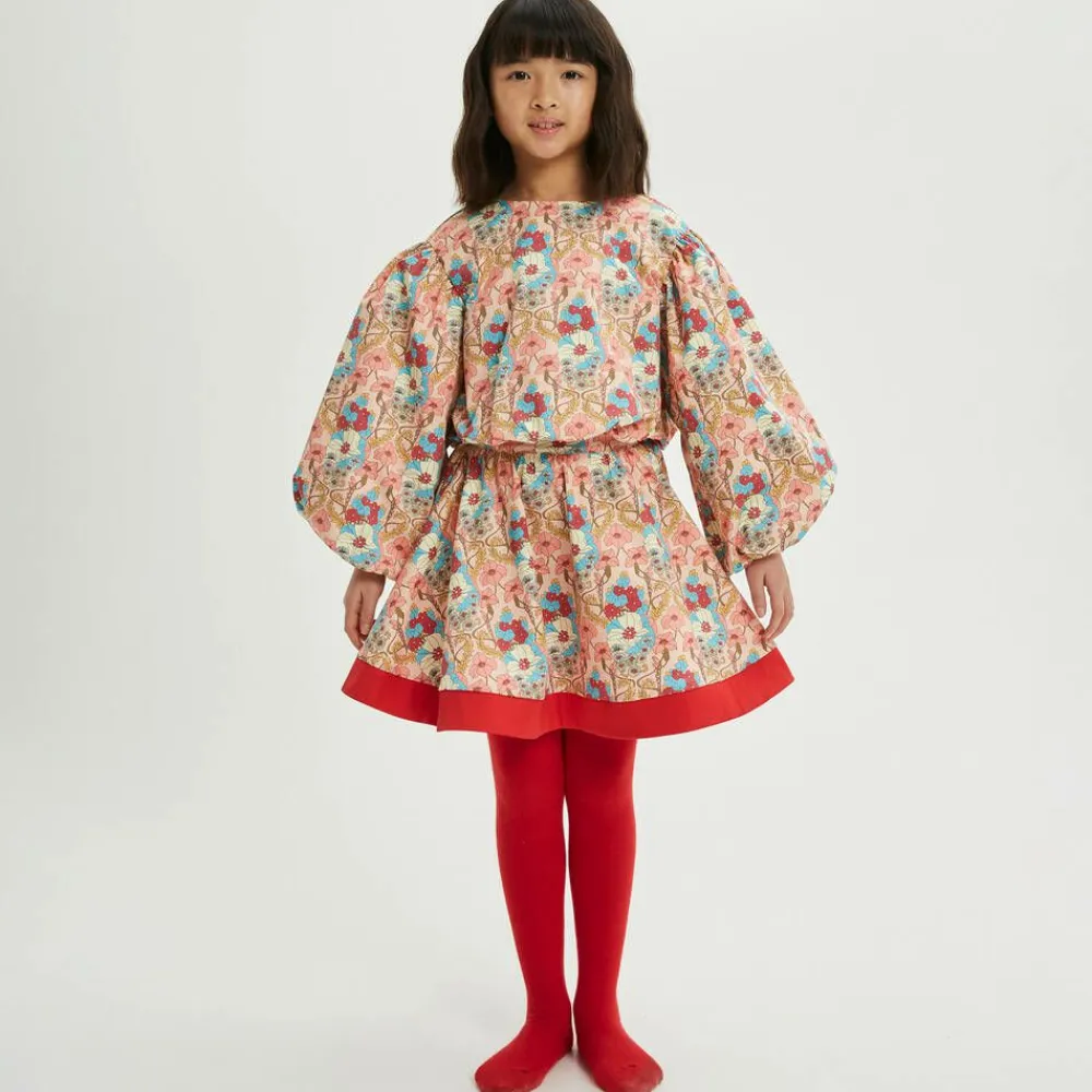 Coral pink blouse for girls by The Middle Daughter, patterned with 60's inspired florals. Woven in soft cotton sateen, this cropped-length top has statement puffed sleeves and a stylish bubble hem. It fastens with a concealed zip on the back and is lined in lightweight cotton for comfort.