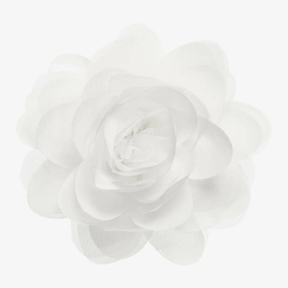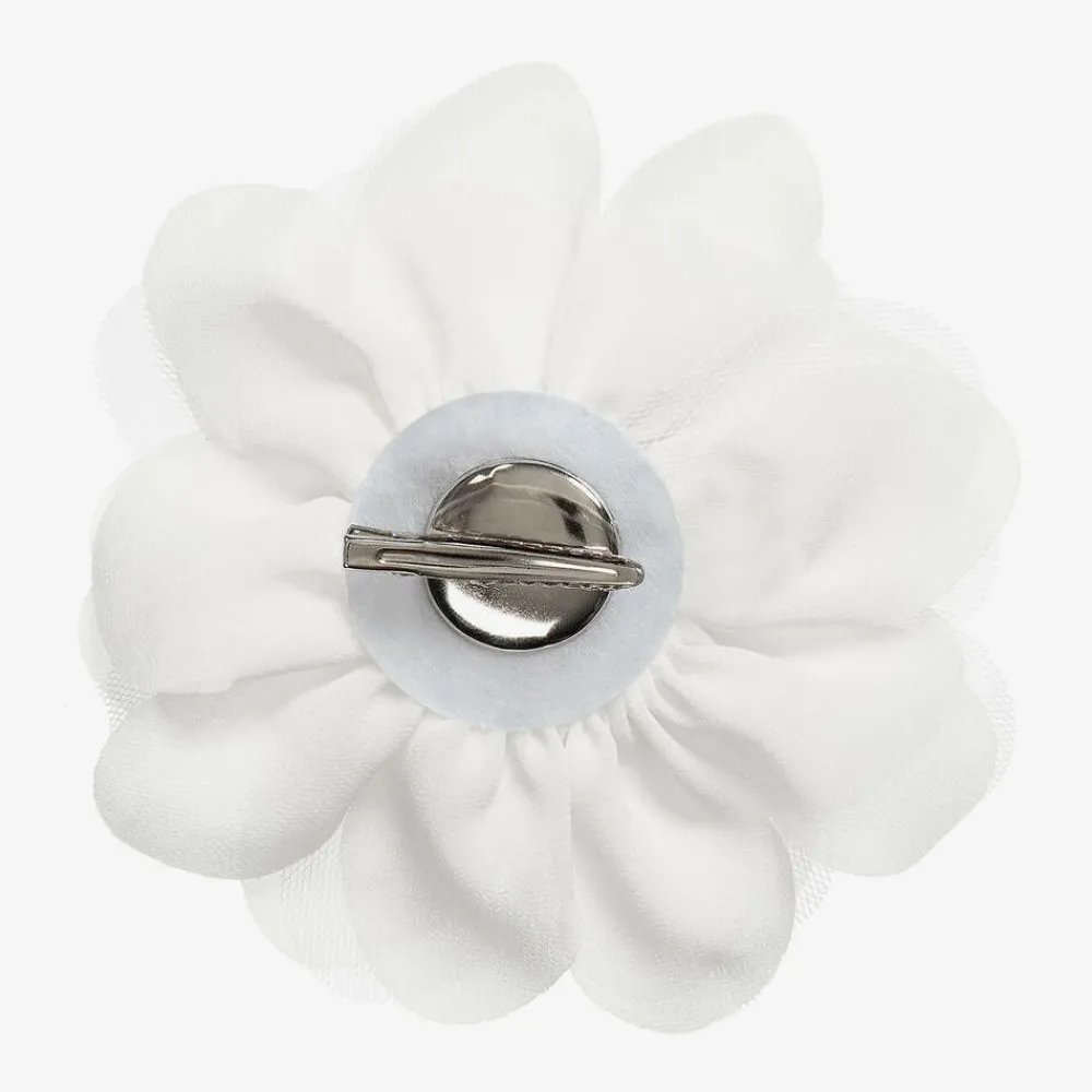 A pretty off-white hair clip for girls by The Tiny Universe, with a large tulle and chiffon flower. The metal slide on the back has small teeth, helping to keep the clip neatly in place.