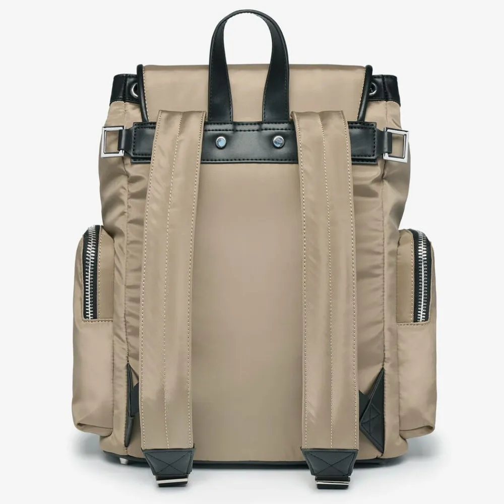 A smart beige changing backpack by TIBA + MARL. It is made in smooth, recycled faux leather with a water-resistant and easy-to-wipe-clean, recycled woven lining. Inside the spacious main compartment, there is a useful laptop pocket, an insulated bottle holder, and an additional elasticated pocket. Stitched with a tonal logo patch, there is a large zipped pocket on the front and two zip-up pockets on the sides, one with insulated lining for extra practicality. Fastening with a drawstring and a magnetic clasp, the front flap has another zipped pocket for small essentials. The back panel and the adjustable straps are padded for added comfort and there is a top handle that can be easily hung on a hook. The D-rings on the sides can be attached to stroller clips (sold separately), and it comes with a zipped pouch and a padded changing mat.