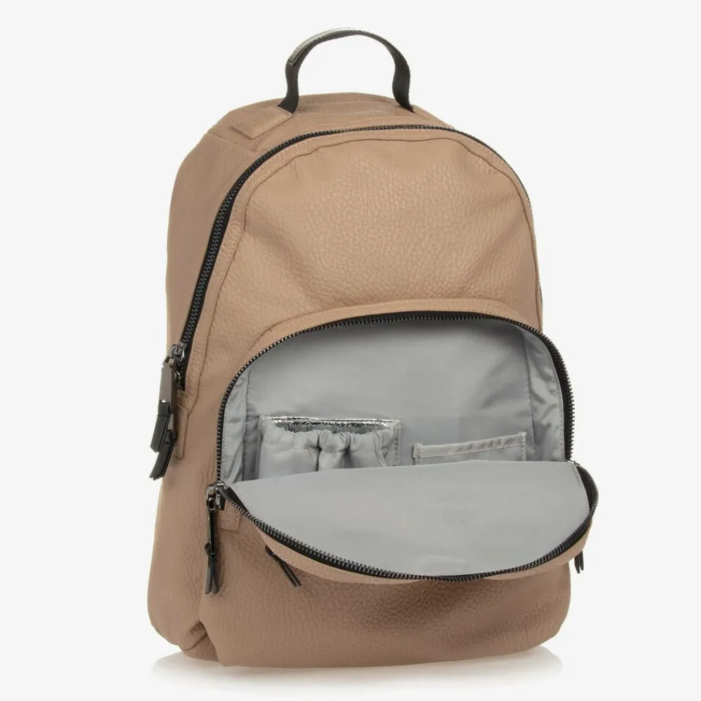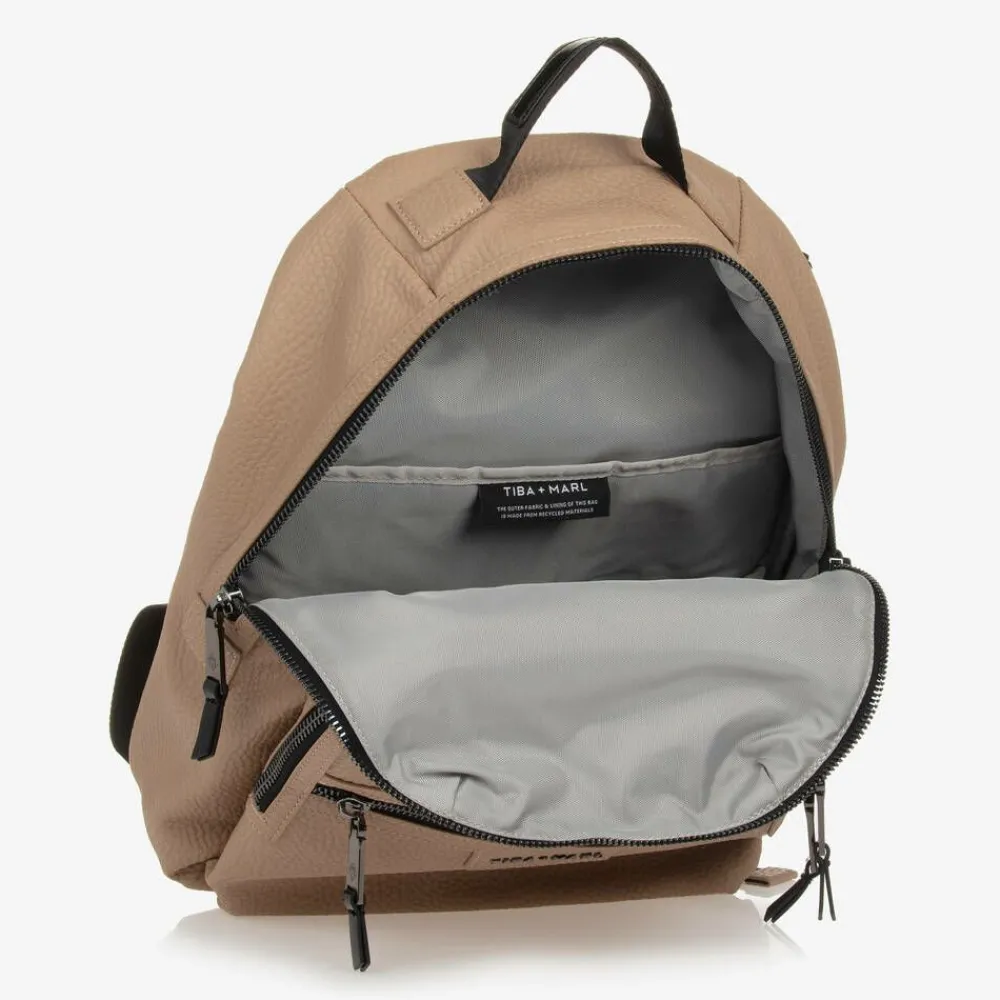 Beige, textured faux leather changing backpack by TIBA + MARL with black, faux patent leather trims. It is made in recycled, textured leather with an easy-to-wipe-clean, recycled woven lining. On the front is a zipped pocket, with an internal smart phone pocket and an insulated bottle holder, and a smaller, outer zipped pocket with a metal logo. Inside the large main, zipped compartment is a useful laptop pocket and two elasticated pockets. For comfort, the back of the backpack is padded, as are the adjustable shoulder straps. There is a webbed carry handle on top and little metal feet on the base. It comes with a zipped pouch and a padded changing mat.