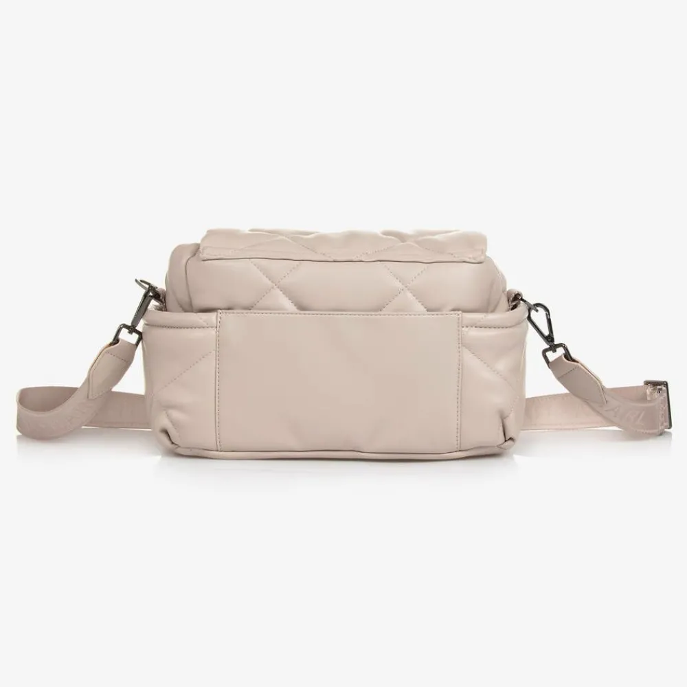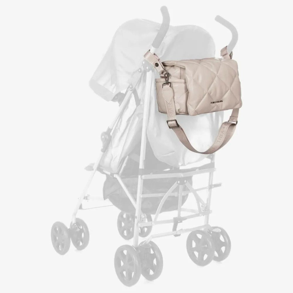 Beige changing bag by TIBA & MARL, made in soft quilted faux leather. The main compartment has an internal pocket and an insulated bottle holder. It fastens with a popper on an internal strap and a popper on the flap. There are multiple external pockets, attached stroller straps and a detachable, adjustable shoulder or cross-body strap. This compact bag has a dark grey metal logo on the front and comes with a padded changing mat.