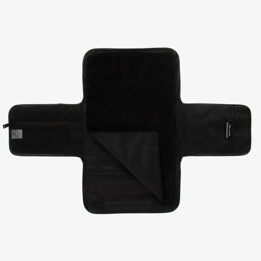 Beige and black changing mat clutch by British brand TIBA + MARL, made in smooth, wipe clean fabric. Fastening with velcro, this multi-functional accessory folds easily into a compact clutch bag with a wristlet to carry on the go. Inside, is a super soft fleece mat that attaches with magnetic poppers. Opening fully, a zipped mesh pocket, a slip pocket and useful elasticated straps help to keep all of your parent and baby items in one place. This is in addition to the large exterior zip pocket. The outer fabric and lining of this item are made from recycled materials.