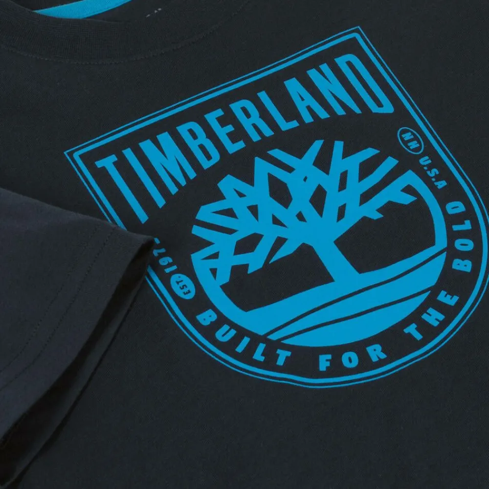 Navy blue cotton T-shirt for boys by American brand Timberland, with a large bright blue logo printed on the front. A timeless wardrobe essential, it is made in soft, comfortable jersey with a crew neck and bright blue overstitch detailing on the shoulders.