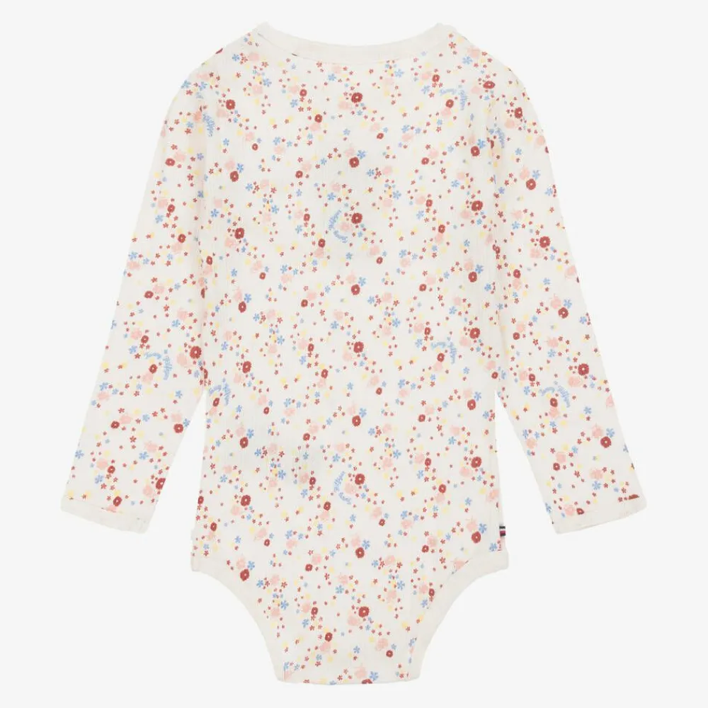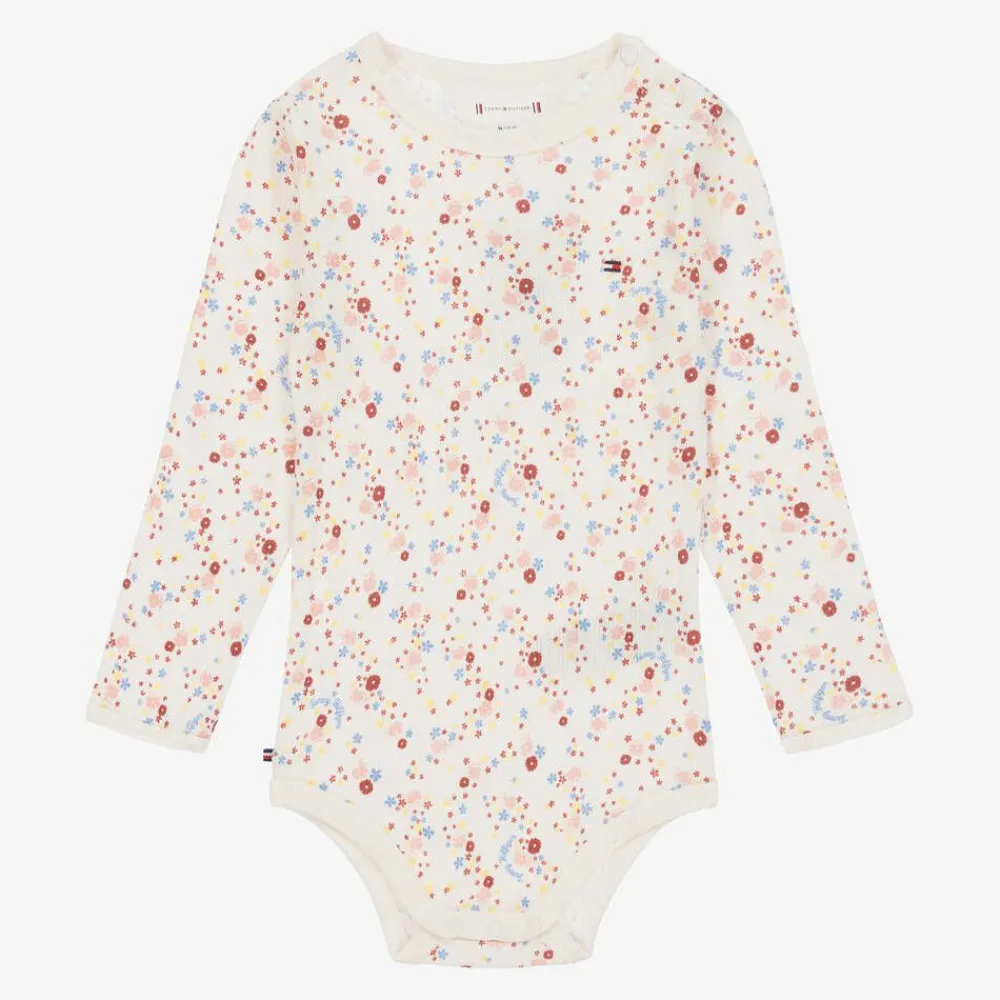 A pack of three, ivory and pink long-sleeved bodysuits for baby girls by Tommy Hilfiger, made in soft cotton jersey with a pretty pointelle pattern. Designed with practical popper fastenings on the shoulder and between the legs, one is plain pink, one is floral patterned and one is ivory with a lovely red logo design. All three feature the American brand's signature flag embroidery for a discreet designer touch and come presented in a stylish, branded gift box.