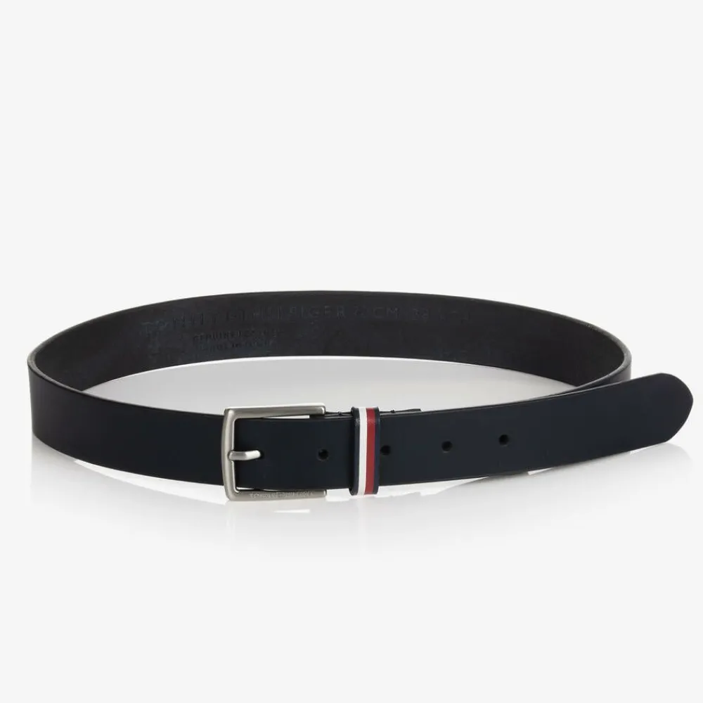 Classic navy blue leather belt for boys and girls by American designer, Tommy Hilfiger. It has a matt silver metal buckle with engraved logo and the brand's signature colour stripes on the loop.