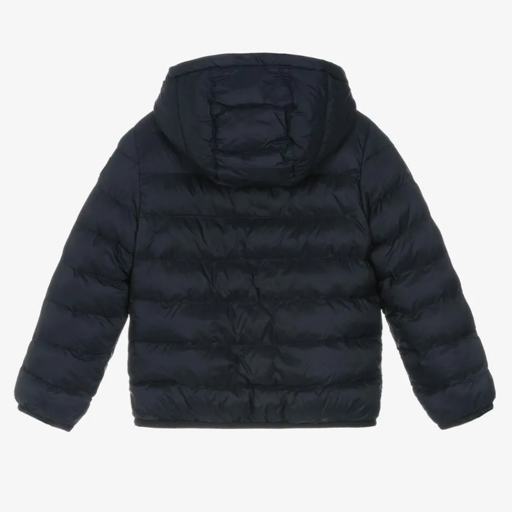 Navy blue padded puffer jacket for boys and girls by Tommy Hilfiger, with a warm hood and signature flag logos. Silky smooth, it has popper-fastening front pockets and gently elasticated trims printed with repeat logos for extra cosiness. The outer material and padding of this product is made with at least 95% recycled polyester.
