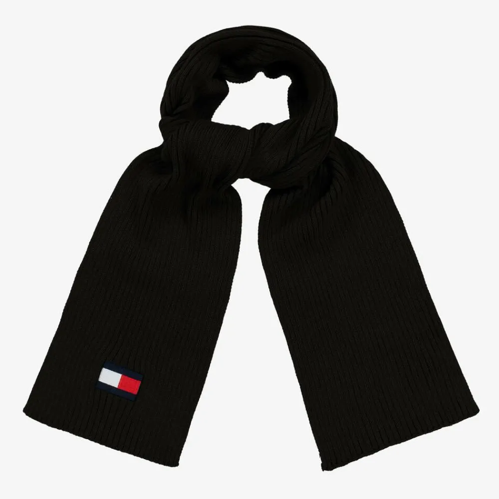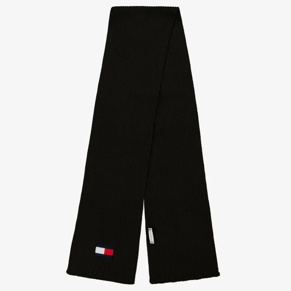 Black scarf for boys and girls by Tommy Hilfiger, made in a soft, ribbed cotton blend knit. Ideal for those colder days, this cosy scarf has the brand's iconic flag logo appliqué on one end for a distinctive designer look. This product is made with at least 50% organic cotton.