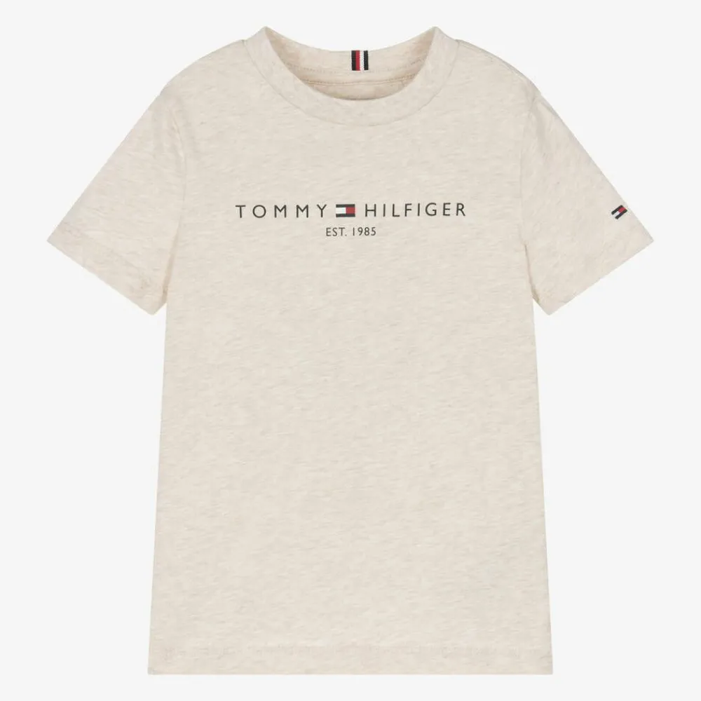 Beige marl T-shirt for boys and girls by Tommy Hilfiger, made in soft and comfortable cotton jersey. Ideal for casual wear, it has a classic crew neck and short sleeves. For instant brand recognition, there is a large navy blue logo printed across the chest, with the iconic flag logo embroidered on one sleeve and a striped tab on the back of the neckline in the designer's signature colours of red, white and blue. Smaller sizes have popper fastenings on one shoulder.