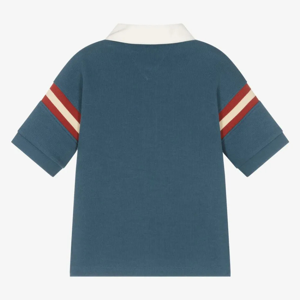 Blue short-sleeved rugby shirt for boys by Tommy Hilfiger, made in soft, mid-weight cotton jersey. Designed with a white twill collar and concealed button placket, it has an ivory embroidered varsity-style logo on the chest. There are red and ivory striped trims on the sleeves for a sporty look, along with the brand's iconic flag logo by one cuff, and signature striped trims on the split hem for added designer appeal.