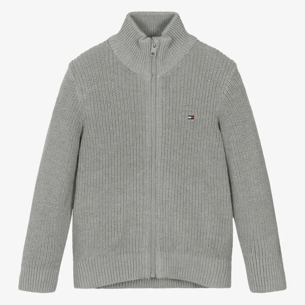 Grey cardigan for boys by Tommy Hilfiger, knitted in a soft ribbed cotton blend. Ideal for layering on colder days, it has a stand-up collar with a full zip fastening and useful chin guard. For a subtle designer finish, the brand's iconic flag logo is embroidered on the chest.