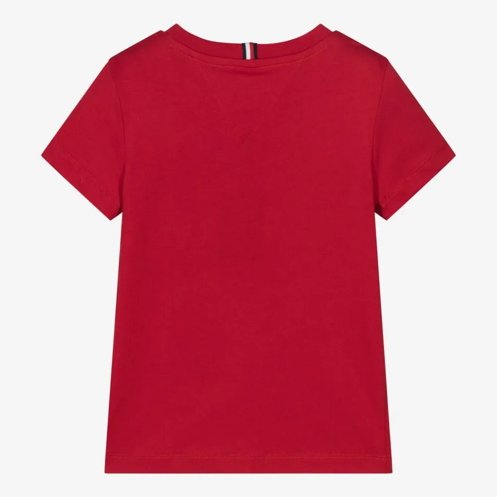 Classic red cotton T-shirt for boys by Tommy Hilfiger, made in soft, comfortable jersey. To add a little designer style to casual days, it has white logo, tricolour stripes and signature flag detailing.