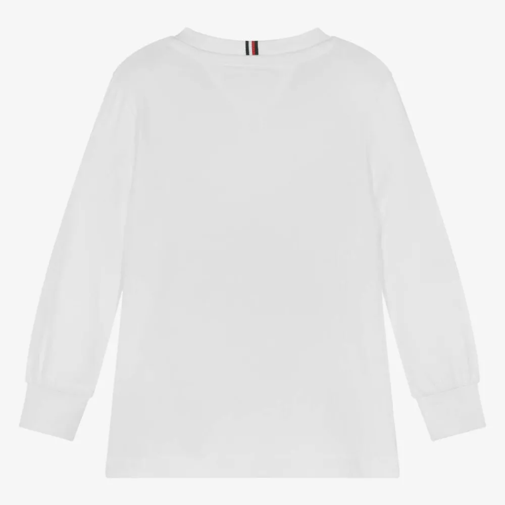 White long-sleeved top for boys by Tommy Hilfiger, made in soft cotton jersey. This classic, casual top has a navy blue logo printed on the front with the brand's iconic flag logo above for instant recognition. For added designer appeal, there is a further flag logo embroidered on one sleeve and signature striped detailing on the back of the neck.