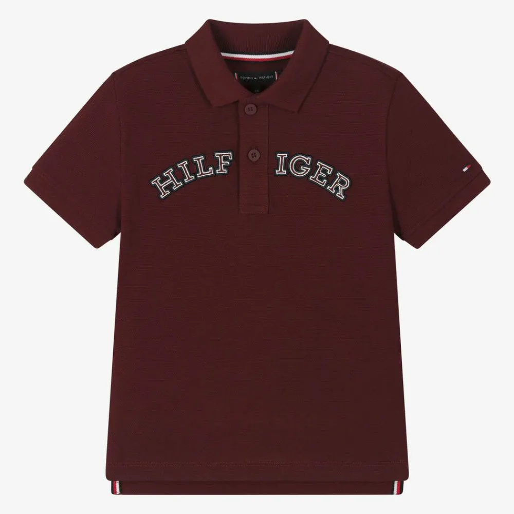 Sporty burgundy red cotton polo shirt for boys by American brand Tommy Hilfiger, with a varsity style logo embroidered across the front in burgundy red, white and blue. Made in comfortable piqué, it has short sleeves, classic, ribbed trims and branded button fastenings on the placket. The side seams are vented for comfort, with trims in the label's signature colours.