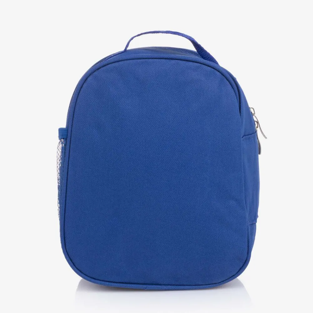 Blue canvas lunch bag for boys by Treat Republic, with a smooth and hygienic wipe-clean lining. Gently padded, it features a detachable, personalised flap-over front, with a cool superhero design. The main compartment has an internal mesh pocket and fastens easily with a zip. There is a slip pocket on the front, a mesh side pocket, ideal for bottles and a carry handle on the top.