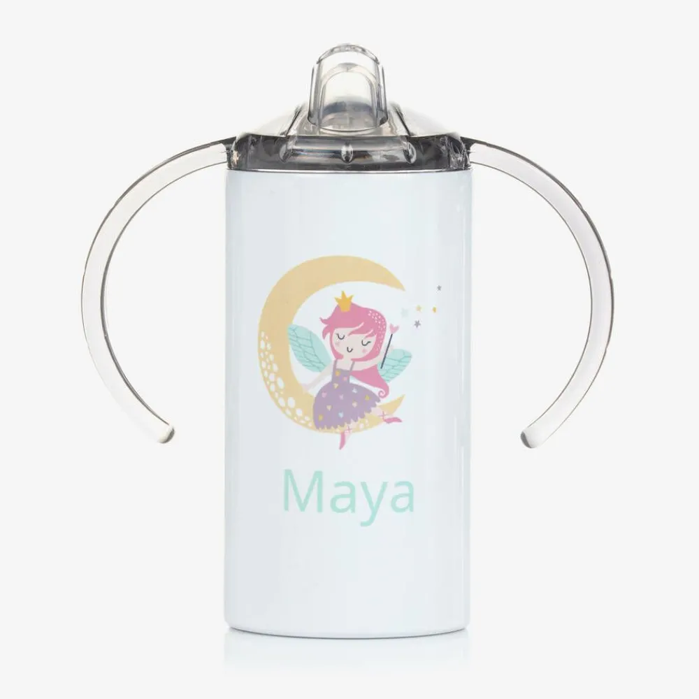 Cute white 400ml sippy cup for girls by Treat Republic, printed with a sweet fairy and moon on the front. Your little girl's name can be printed underneath, adding a personalised touch to this lunchtime essential. Made in stainless steel, the cup has a useful plastic screw lid with easy-to-grip handles on the side.