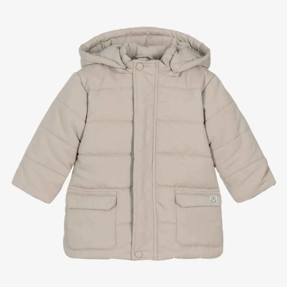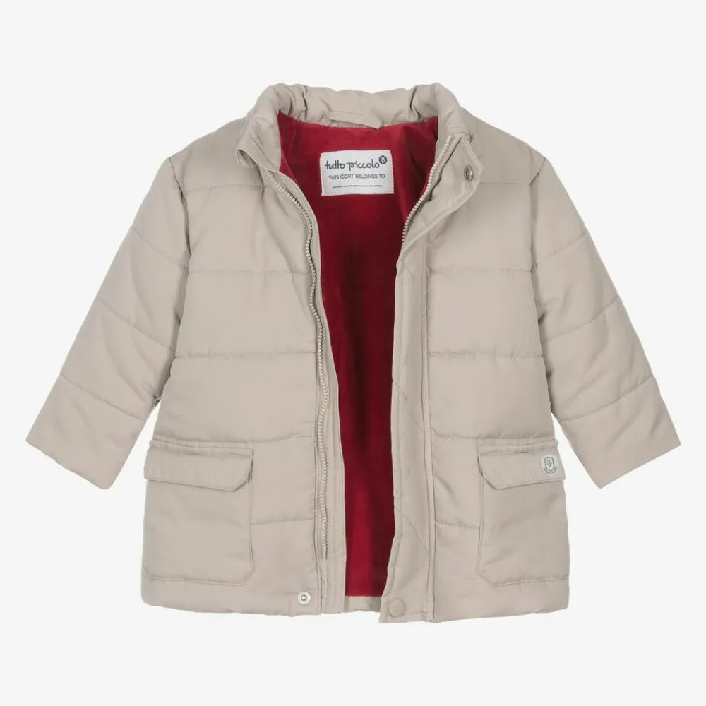 Beige hooded puffer coat for boys by Tutto Piccolo, with a detachable hood. The outer fabric has a lovely peached feel and the coat is warmly padded and lined in soft red fleece for cosy wear. It fastens with a zip beneath a popper flap and has two useful flap pockets on the front.