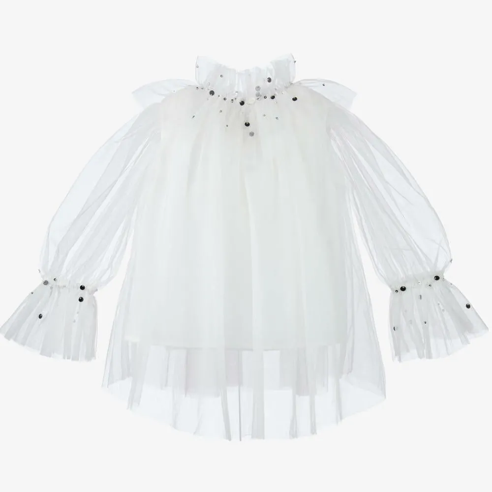 Off-white Harlequin costume top for girls by Tutu du Monde, made from soft and lightweight tulle with a breathable cotton lining. A unique party piece, it has an oversized ruffled collar, sheer puff sleeves, and a keyhole button fastening on the back. The elasticated cuffs and rounded neckline are hand-embellished with silver and black sequins for added sparkle. Black tulle pom-poms on the front complete the circus-inspired look.