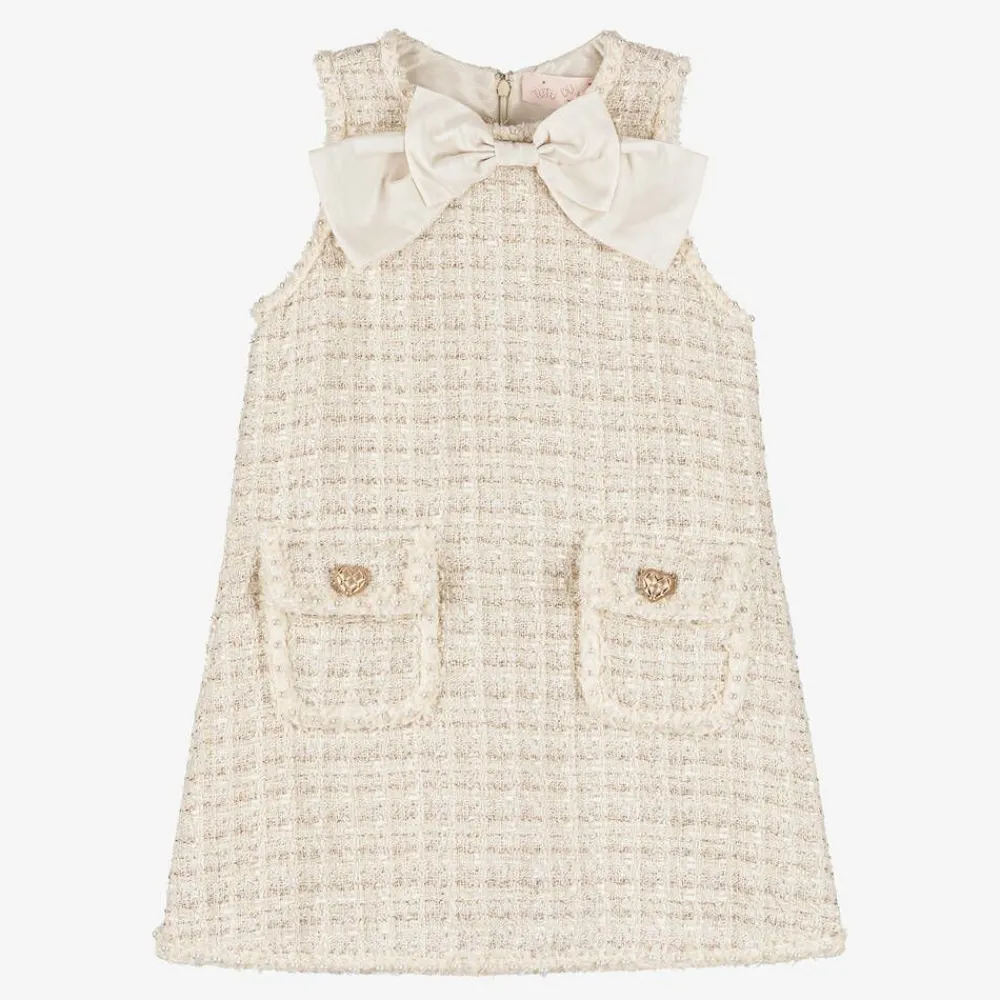 Ivory with a sparkly gold thread, this stylish shift dress for girls is by Australian brand Tutu du Monde. It has textured trims, beautifully hand-embellished with faux pearls for a timeless classic look. Lined in silky fabric for a luxurious feel, the dress has two front pockets, trimmed with elegant gold-tone heart buttons. It secures down the back with a concealed zip and hook fastening, and is finished on the front with a detachable statement bow.