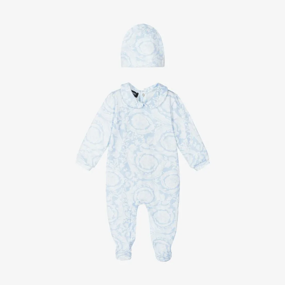 Light blue babygrow and hat set for boys by luxury Italian fashion house Versace, made in soft cotton jersey. For a distinctive look, both pieces are patterned in the designer's iconic Barocco print in white. The babygrow has a sweet Peter Pan collar, with gold-tone popper fastenings on the back and between the legs to help with dressing. Coming in a branded gift box, this lovely set makes an ideal present for a new arrival.