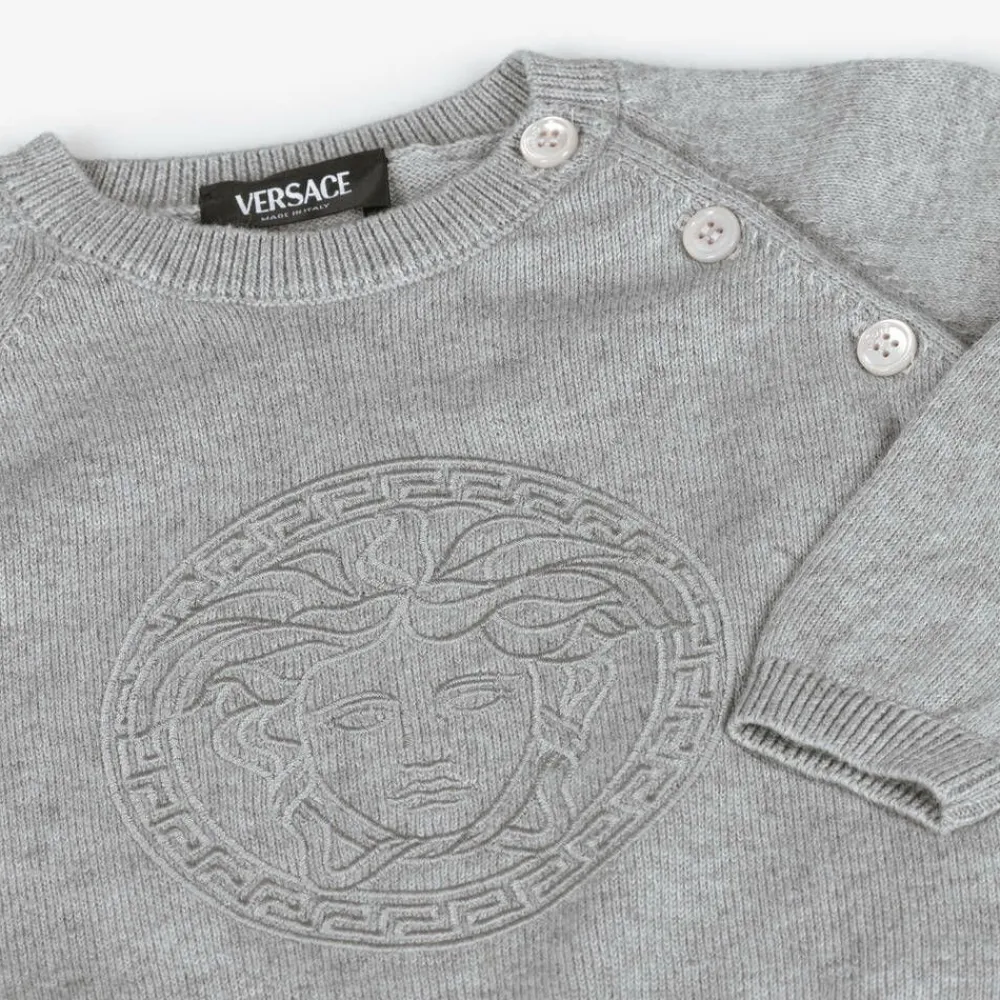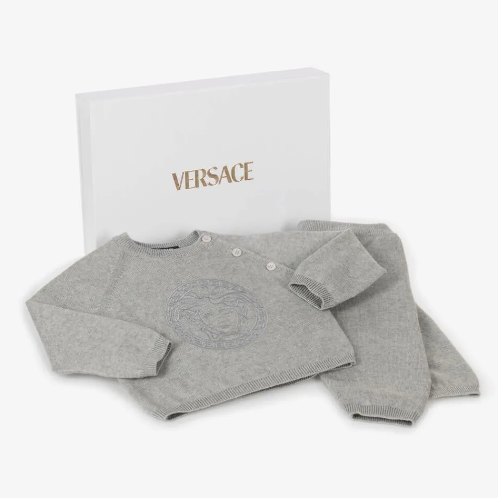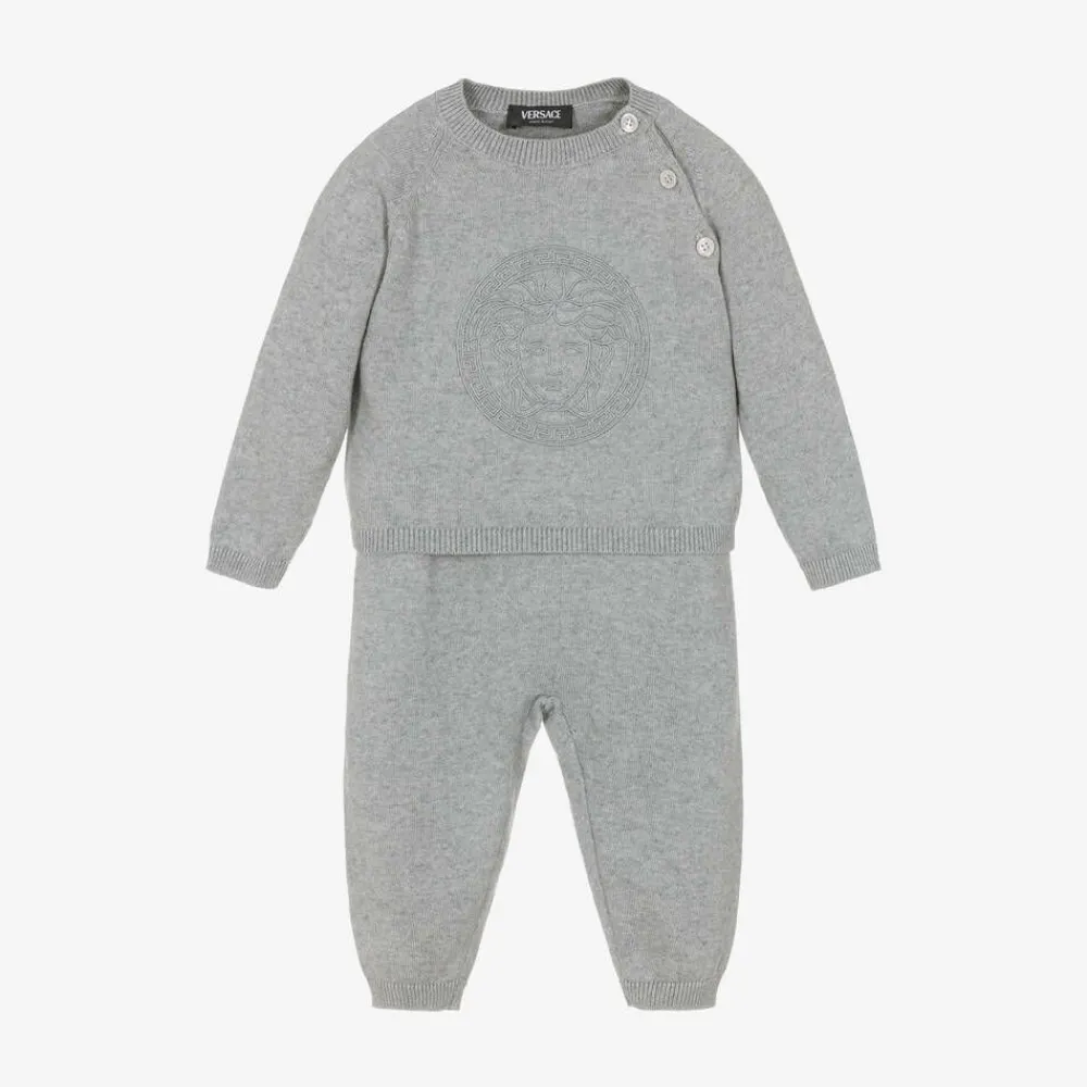 In luxurious cotton and cashmere, this light grey knitted trouser set for baby boys and girls is from Italian fashion house Versace. Enhanced by the designer's embroidered Medusa artwork, the sweater fastens with branded mother-of-pearl buttons on the shoulder and the cuffed trousers have an elasticated waist for lasting comfort. A wonderful present idea, these items come with a branded gift box.