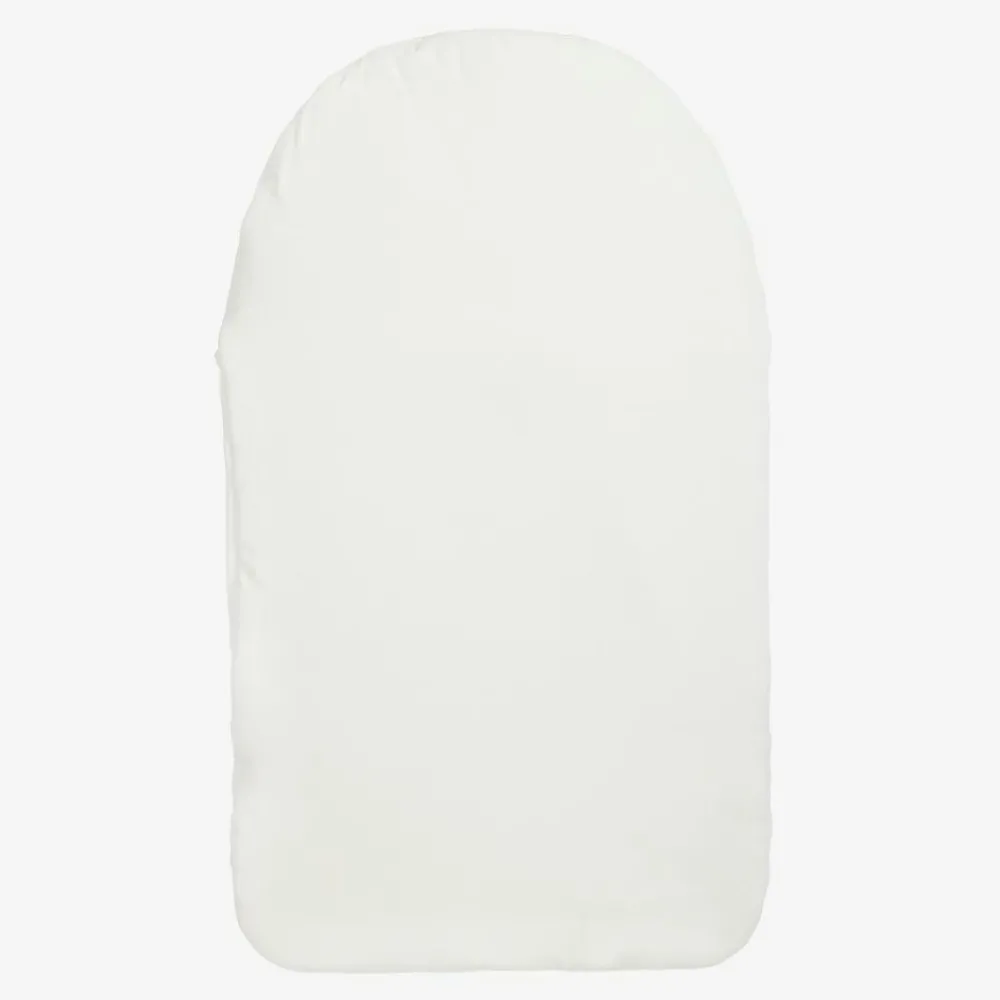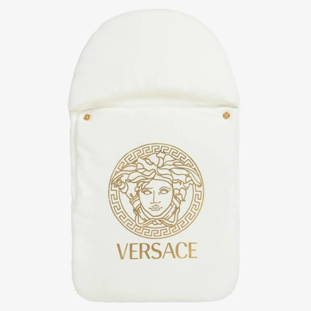 A soft and cozy ivory cotton jersey nest by Versace, suitable for boys and girls. Lightly padded, it has the brand's iconic Medusa logo printed on the front in gold foil. There are gold popper fastenings with matching Medusa emblems on both sides and a large snuggly hood.