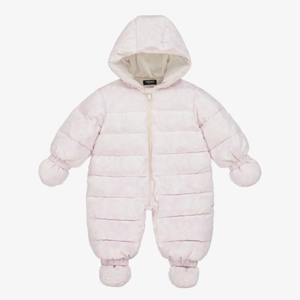 Pale pink and white puffer snowsuit for baby girls by luxury Italian brand Versace. It is patterned in the designer's iconic Barocco print for a distinctive look. Silky smooth and lined in comfortable cotton jersey, it has soft down padding for superior comfort and warmth. There is a front zip fastening and a fixed hood, with detachable mittens and booties which attach with buttons.