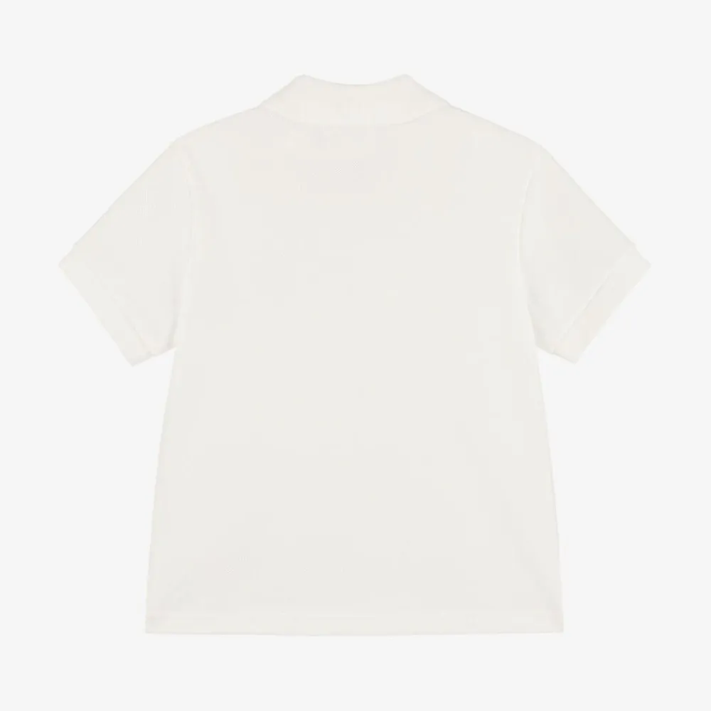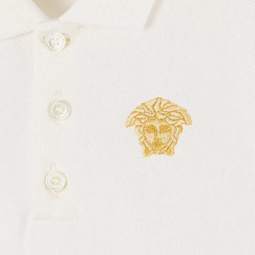 Off-white short-sleeved polo shirt for baby boys by Italian luxury designer Versace. It is made in soft cotton piqué, with the iconic Medusa logo embroidered in gold for a signature look. This smart-casual top has a ribbed collar and cuffs, with pearlescent branded button fastenings on the front.