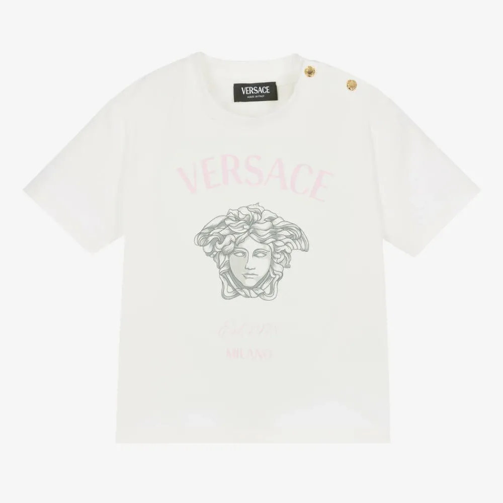 Off-white short-sleeved T-shirt for baby girls by Italian luxury brand Versace. Instantly recognisable, it has the iconic Medusa logo printed on the front, with the designer's name in pink. Made in soft cotton jersey, this casual tee has a crew neckline and gold-tone poppers on one shoulder to assist with dressing.
