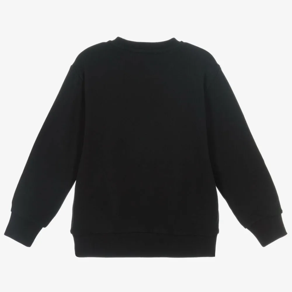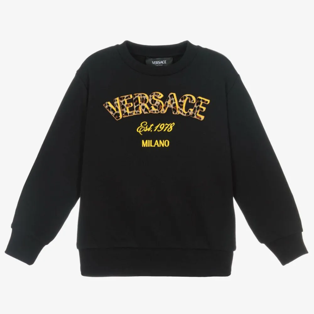 Inspired by the adult collection, a black cotton sweatshirt for boys and girls from luxury Italian brand Versace, made in soft, mid-weight jersey for comfortable wear. Adding a designer touch to a casual piece, this long-sleeved top has a striking logo motif on the front, featuring flocked leopard print and eye-catching gold embroidery. A classic crew neckline and lightly ribbed trims, complete the relaxed look.