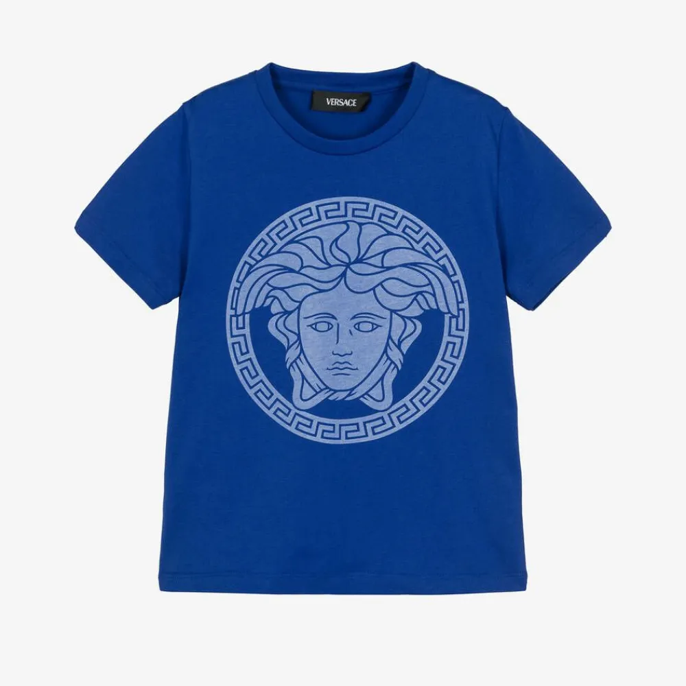 A blue cotton T-shirt for boys and girls from the luxury Italian brand Versace. Made in soft jersey, the brand's iconic Medusa logo is printed on the front in a lighter shade of blue for a designer finish.