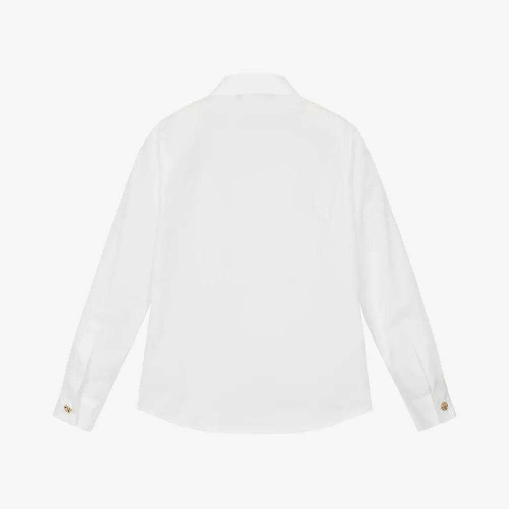 A smart white cotton shirt for boys by luxury Italian label Versace, featuring the brand's distinctive black logo patch on one cuff. Made from soft, lightweight poplin, this classic style is completed with gold-tone Medusa embossed buttons on the neckline and cuffs.