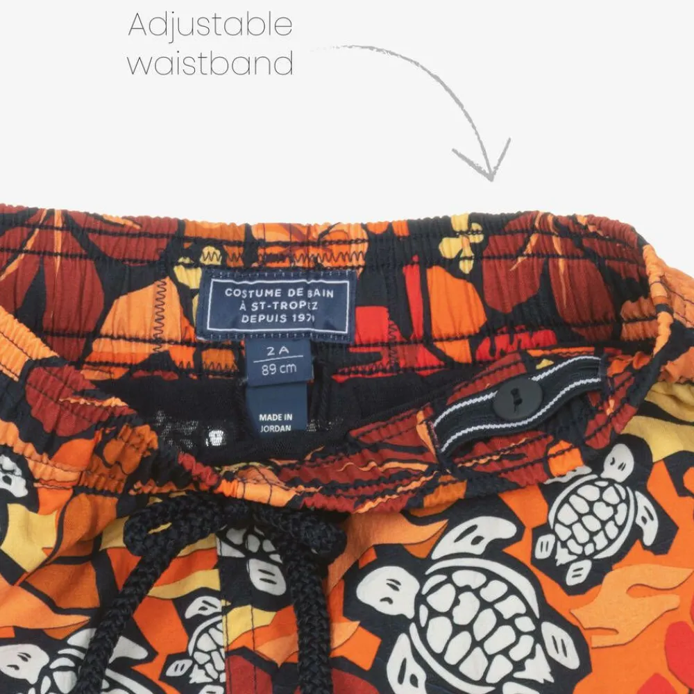 Vibrant orange swim shorts for boys by Vilebrequin, patterned with a tropical palm tree and turtle print. Silky and lightweight, they have a comfortable mesh lining and concealed side seam pockets. The back pocket secures with velcro and the elasticated waistband is detailed with a fixed drawstring.
