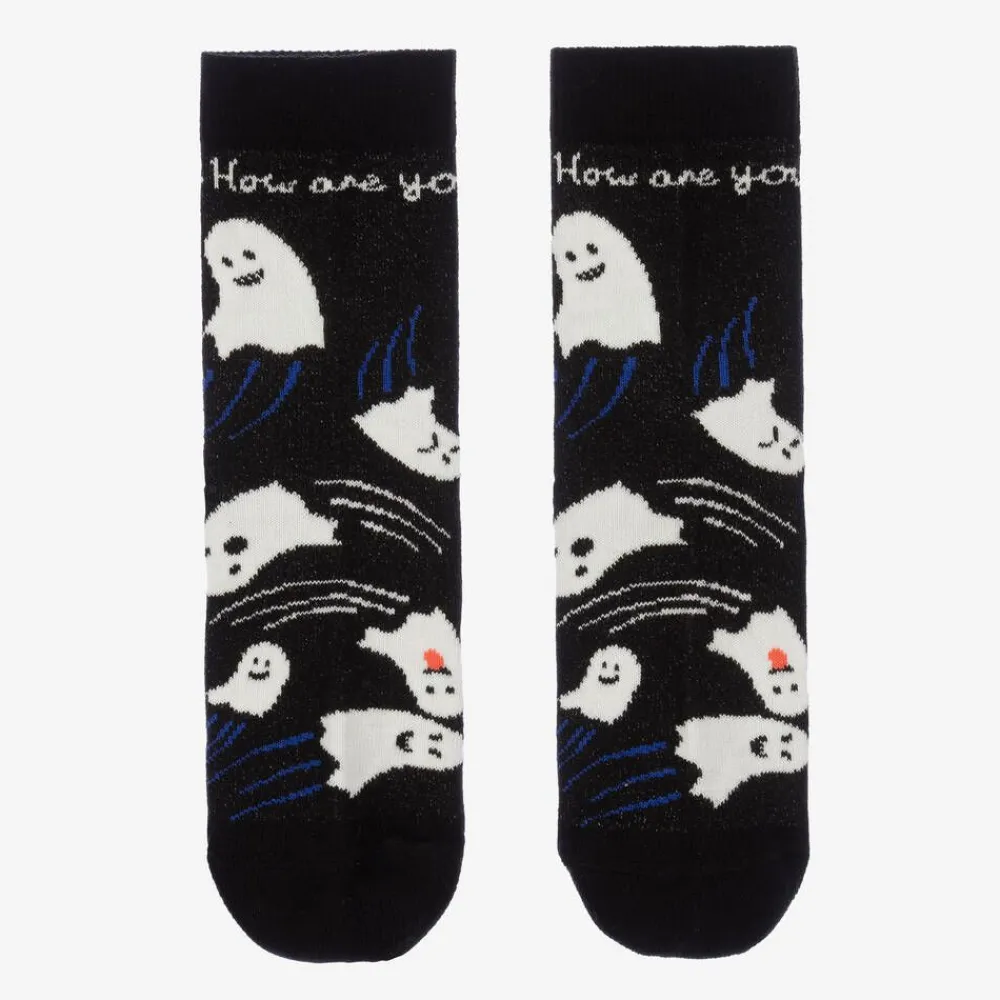 Spooky black socks for boys and girls by Wauw Capow. Made in soft organic cotton, these socks have a playful ghost design on the front, complete with 'how are you boohing?' pun, for a fun twist. They have the brand's logo stitched on the sole for a subtle branded finish.