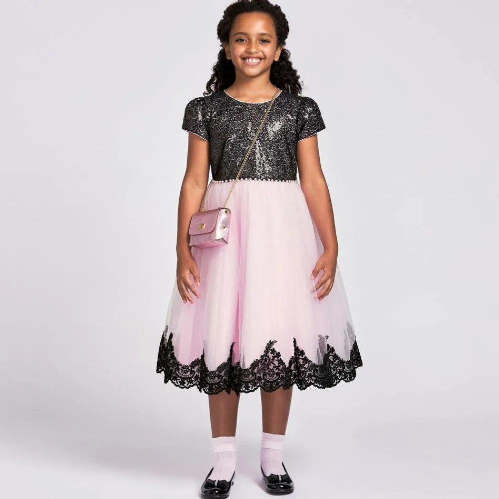 Beautiful metallic pink bag for girls by Italian brand Zaccone, in grained faux leather. Lovely for accessorising a special occasion outfit, it has a leather-lined main compartment with a gold twist clasp fastening on the front. The bag is worn using the gold chain shoulder strap, with sparkly diamanté's decorating the eyelets.