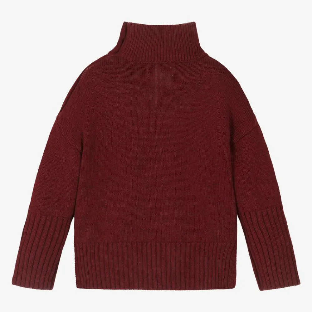 Deep red sweater for girls by Zadig&Voltaire, inspired by the adult collection. Knitted in a mid-weight wool blend, this warm layering piece features the word 'KISS' on the front and a pointelle ZV signature on the hem. Higher on the collar, it has black crest button fastenings on one shoulder and thumbholes on the cuffs. The ribbed knit hem has side vents and falls longer at the back for a more relaxed look.