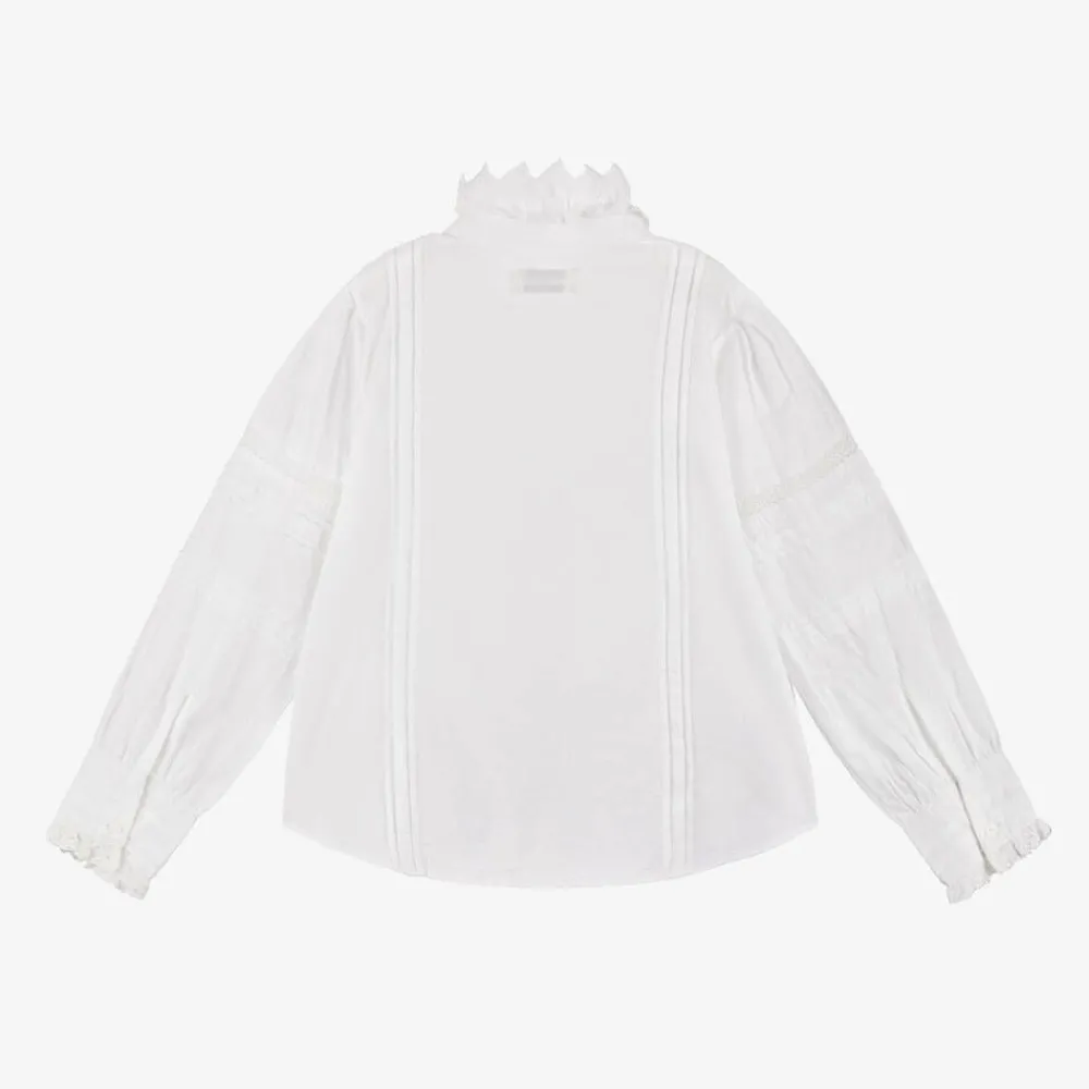 Beautiful white cotton blouse for girls by French designer Zadig&Voltaire, taking inspiration from the adult collection. Lightweight and semi-sheer, the stylish high-neck design features delicate crochet lace, zigzag edged ruffles and neat pintuck detailing. It buttons up on the front and cuffs.
