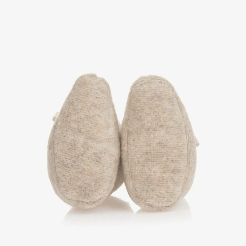 Beige booties for baby boys and girls by Spanish brand 1 + in the family, made in soft bamboo blend polar fleece. Warm and cosy, they have an adjustable button fastening on the front to keep little feet snug and a button and loop on the back to keep them together and prevent one getting lost.