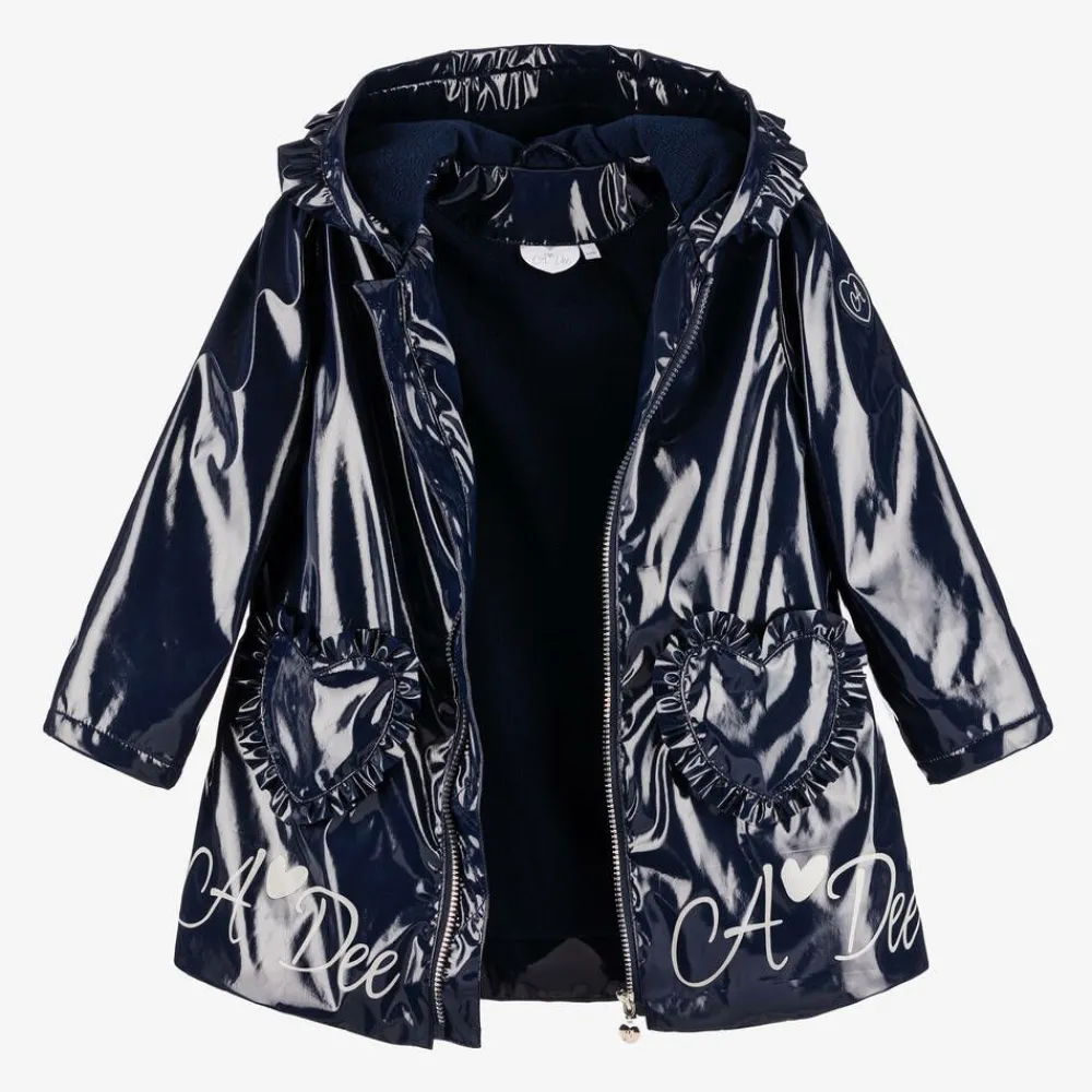 A glossy navy blue hooded raincoat for girls by A Dee, with pretty ruffle trims. Water-resistant and cosy, it has a soft fleece lining and fleece-lined, heart-shaped pockets on the front. Reflective logo prints on the front and back, and a logo patch on one sleeve, add a stylish yet functional designer touch. The diamanté-trimmed zip has a silver-tone branded pull and a large ruffle-trimmed heart on the back completes the look.