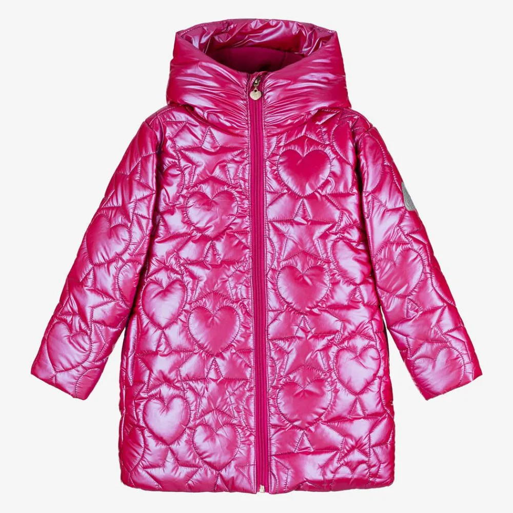 Gorgeous pink coat for girls by A Dee, with a pretty iridescent sheen. Lovely for colder days, it is lined in cosy fleece for warmth and has a useful hood. The quilted design is shaped with cute hearts and stars, and fastens with a smooth zip on the front.